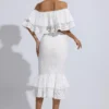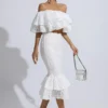 Get the party started in the Anaya White Cutout Ruffle Set! Featuring a strapless ruffled bandeau top and open back, the dress adds a touch of flirty flair to the overall look. The skirt is knee-length, exposing the calf, adding a sexy and playful element to the outfit. Complete the chic look with a delicate necklace and earrings!