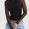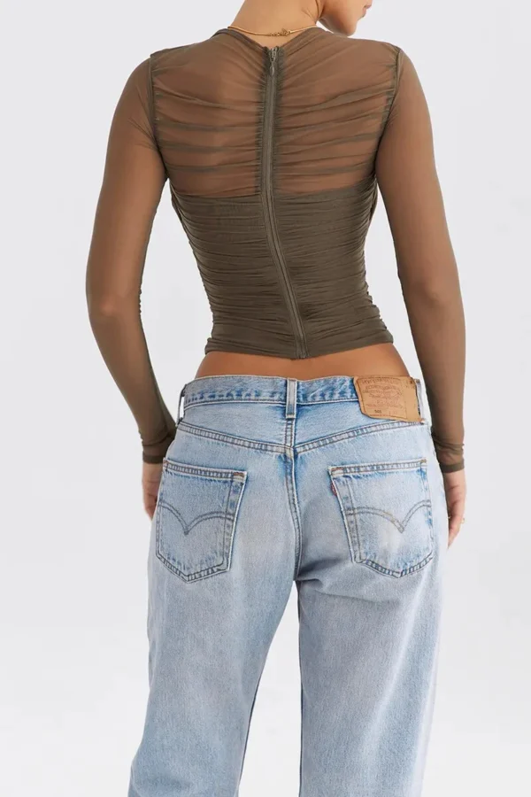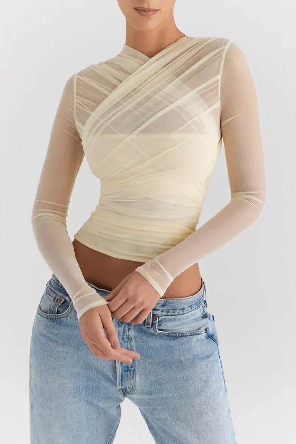 Ignite the night in the sultry Morasatti Party-Top, where dramatic ruching meets sheer elegance in a bold criss-cross design. Its fitted silhouette and translucent sleeves make it a daring statement piece for any evening affair.