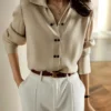 Clean lines, effortless drape, and an air of quiet sophistication—this blouse is designed to elevate your everyday wardrobe with timeless elegance.