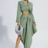 An ideal choice for women’s fashionable wear in spring and autumn — Myra Green Ruffle Blazer Set. The top has a slim fit and has a strap design at the waist, which can be adjusted according to personal preference. The design of the asymmetrical skirt is unique and can perfectly show off the lines of your legs. The ruffle decoration enriches the visual effect and adds interest to the entire outfit. Add to cart and become a fashion forward leader.