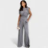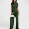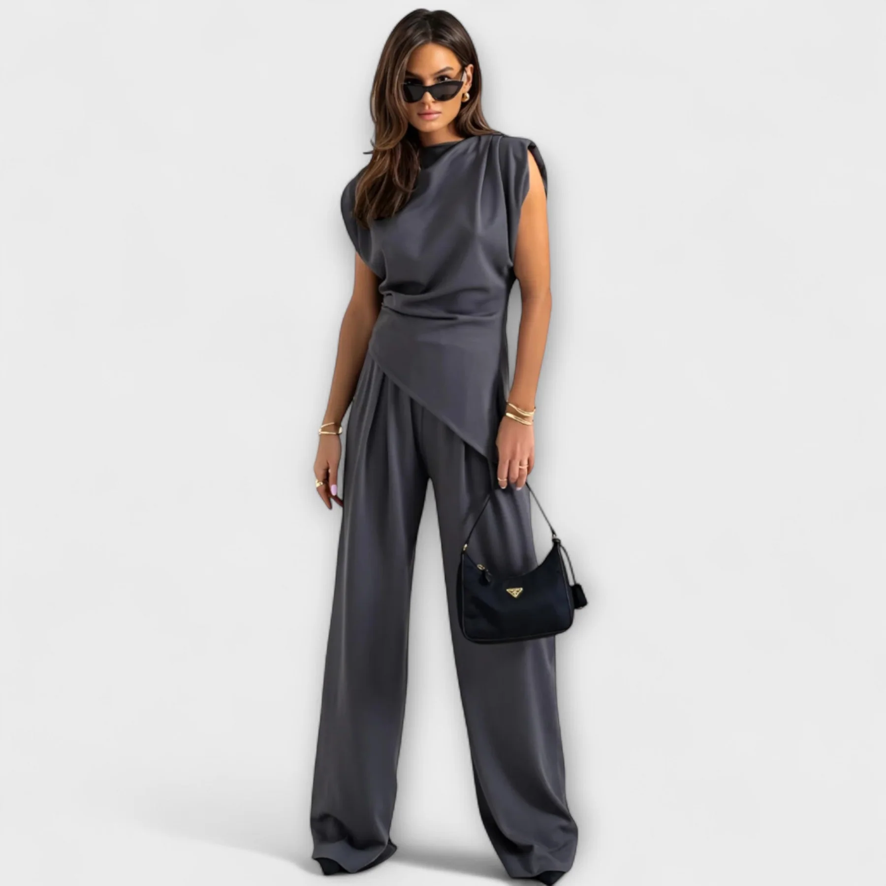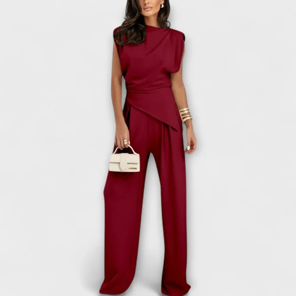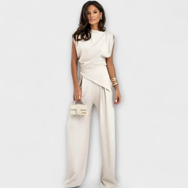 Sculpturale elegantie met een moderne twist – de Sofia-set combineert een asymmetrische top met wijd uitlopende broek voor een stijlvol silhouet met vloeiende lijnen. Perfect voor speciale gelegenheden of om je dagelijkse look moeiteloos te verfijnen.