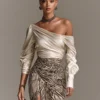 Satin off-shoulder top creates a graceful neckline and bare-shoulder look