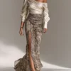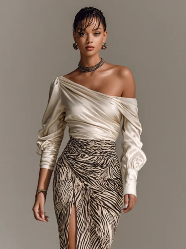 A bold and stylish two-piece set combining a sleek satin off-shoulder top with a zebra print hip-hugging skirt featuring a sexy slit hem. This design effortlessly merges modern elegance with statement-making patterns.
